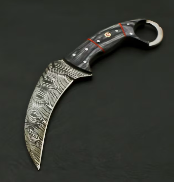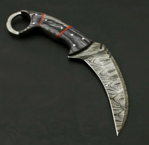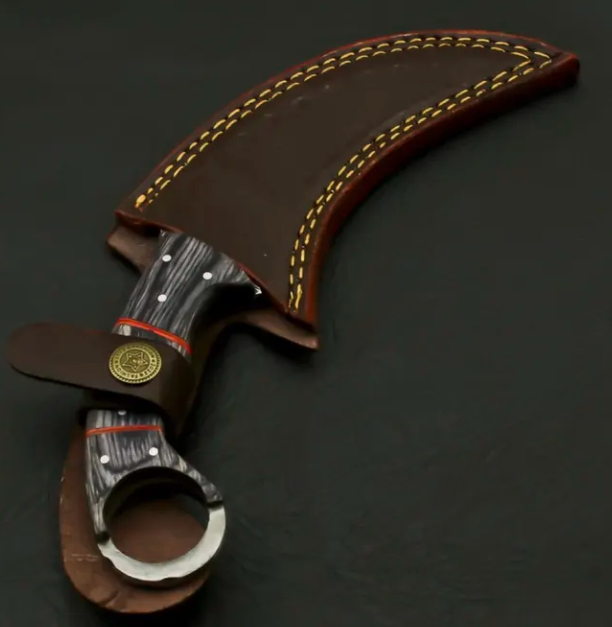 This beautiful hunting knife was designed and made by Ameer Enterprises. Knife is not only stunning in looks but it is also rock solid because of robust construction with its 4 mm thick blade. Beautiful Damascus blade of the knife is the result of hours and hours of forging. Not many makers can keep such pattern of layers upon layers flowing all the way to the edge of the blade, which creates a saw-blade effect at microscopic level, allowing the blade to keep cutting while other blades have dulled. the blade of this knife with 1095 and 15N20 high carbon steel true layers (512).