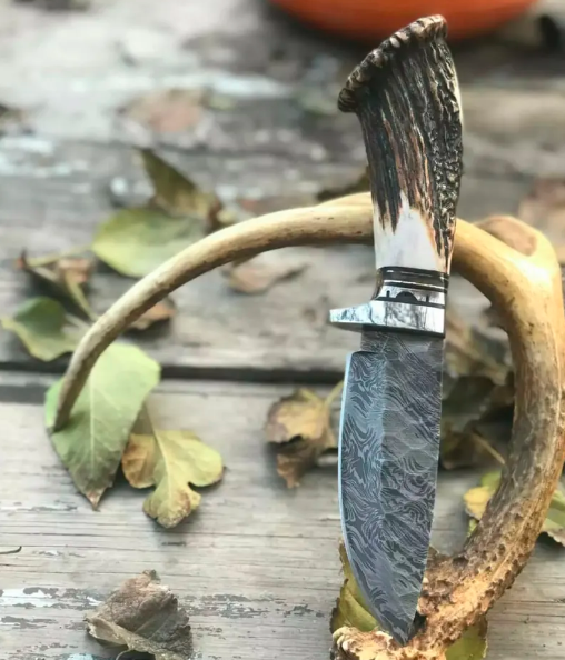 Custom Hand Made Damascus Antler Deer Horn Crown Handle Hunting Knife With Case | Best Gift For Him