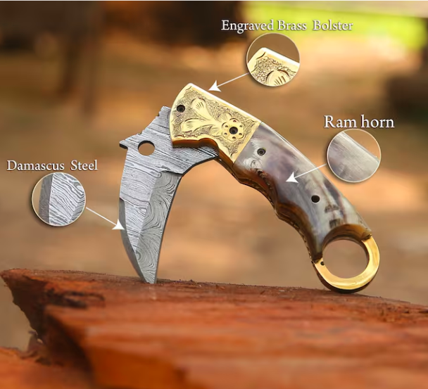 Handmade Damascus Karambit Pocket Knife β Ram Horn Handle & Engraved Brass Bolster β Personalized Gift