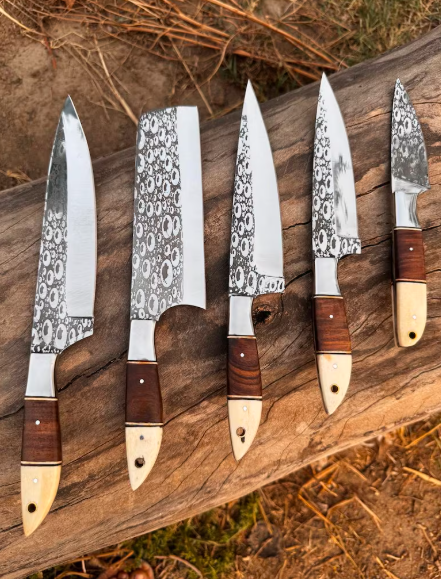 This professional kitchen set includes five essential blades designed for all types of cooking: chopping, slicing, dicing, carving, and filleting. Each handle is beautifully crafted from natural wood and bone, giving every knife a unique character and comfortable grip.