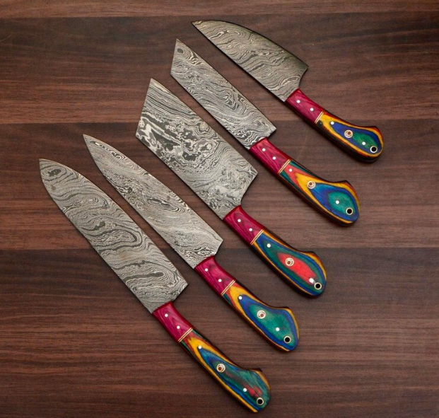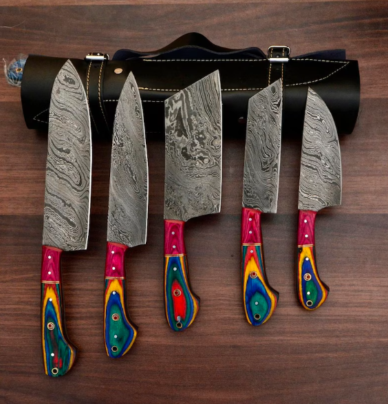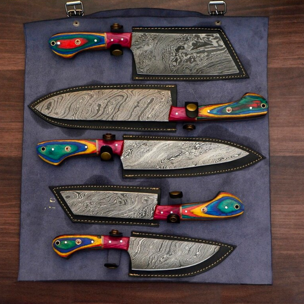 Custom Handmade Damascus Chef Set 5 Pieces Handle Wood /Anniversary Gift, Gift For Chef With Leather Cover, Chef Knife Set, Kitchen Knife, Serbian Knife, Japeness Knife, Gift For her, Gift For Mother, Gift For Girl Friend, Gift For Wife, 6th 8th 30th Anniversary Gift