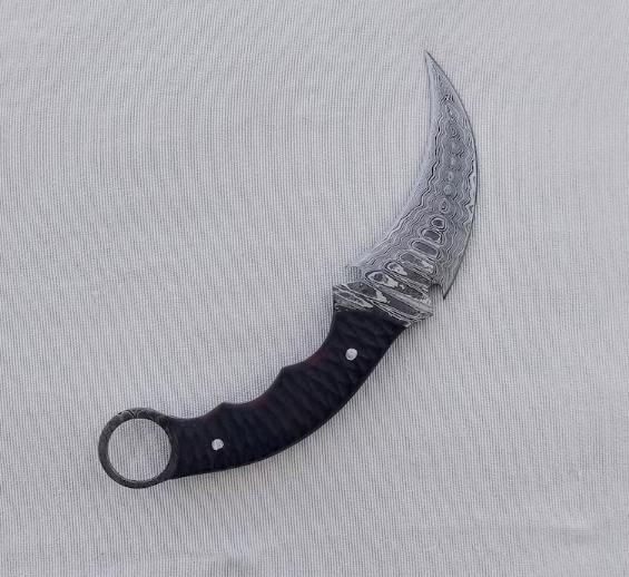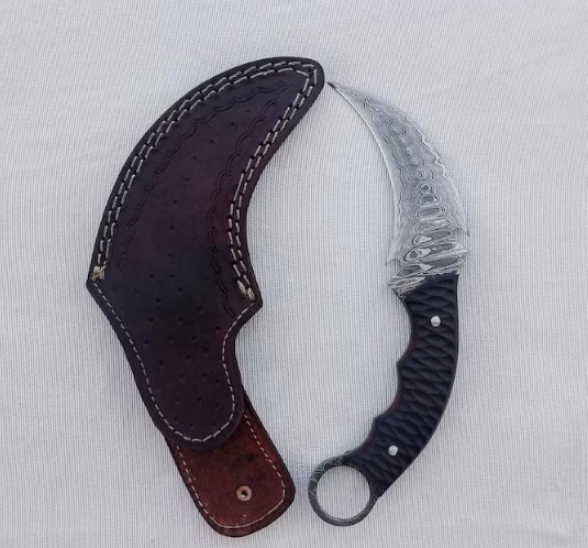 This stunning hand-forged Damascus steel karambit is the perfect blend of beauty, strength, and functionality. Featuring a curved claw-style blade and a full tang handle with a secure finger ring, this knife is designed for collectors, outdoor enthusiasts, and knife lovers alike.