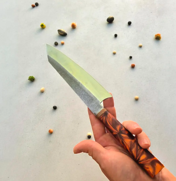 Bring elegance and performance to your kitchen with this custom-made chef knife, forged from premium N690 steel for exceptional sharpness and durability. Each piece features a unique red resin handle pattern, handcrafted to ensure no two knives are ever the same.